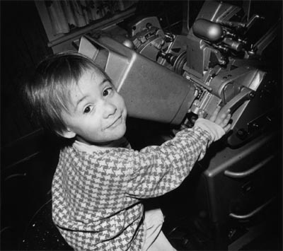 Scott at about two years old, playing with a moviola (a device used to edit film)